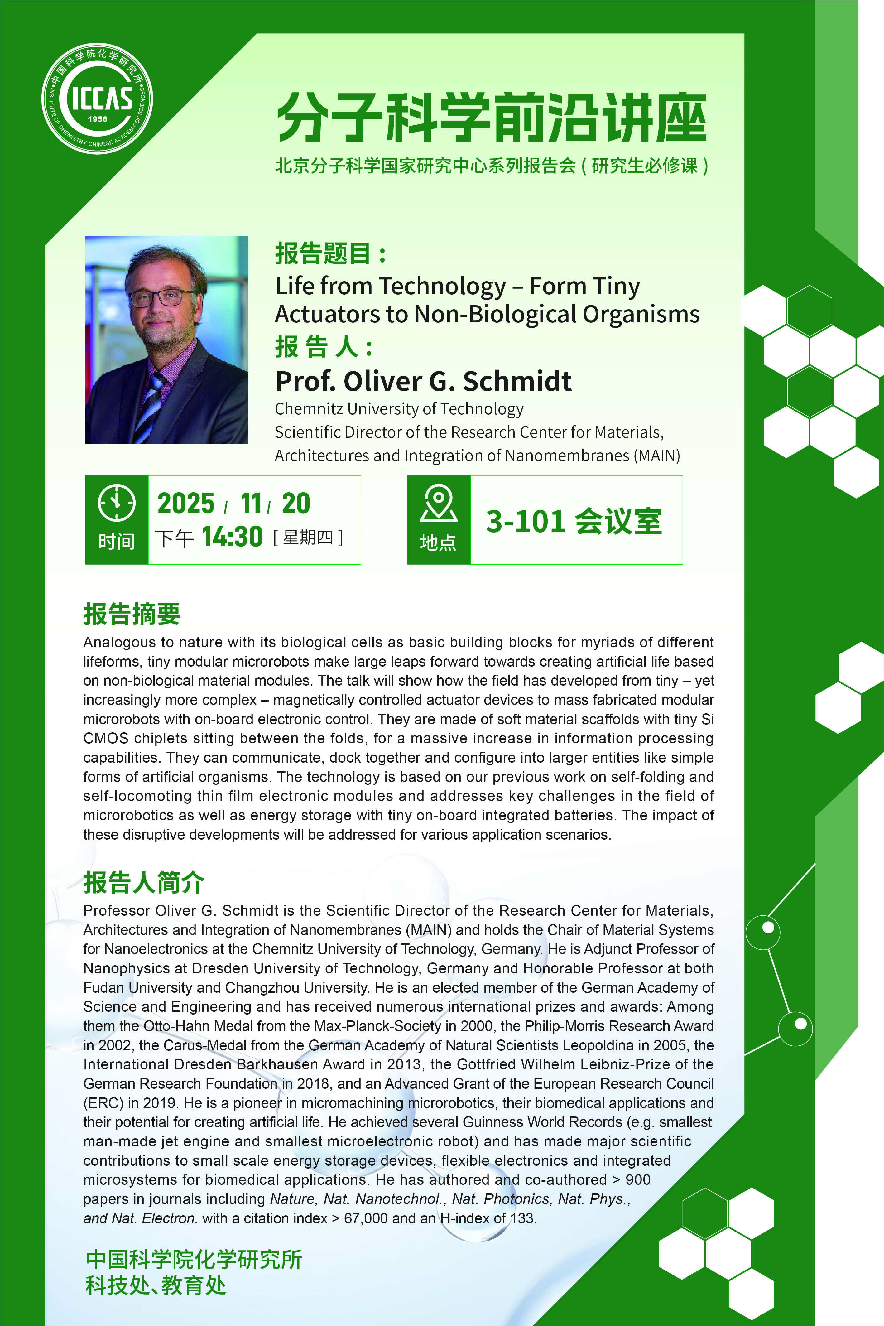 德国开姆尼茨工业大学Oliver G. Schmidt教授拟于2025年11月20日访问化学所并作分子科学前沿讲座