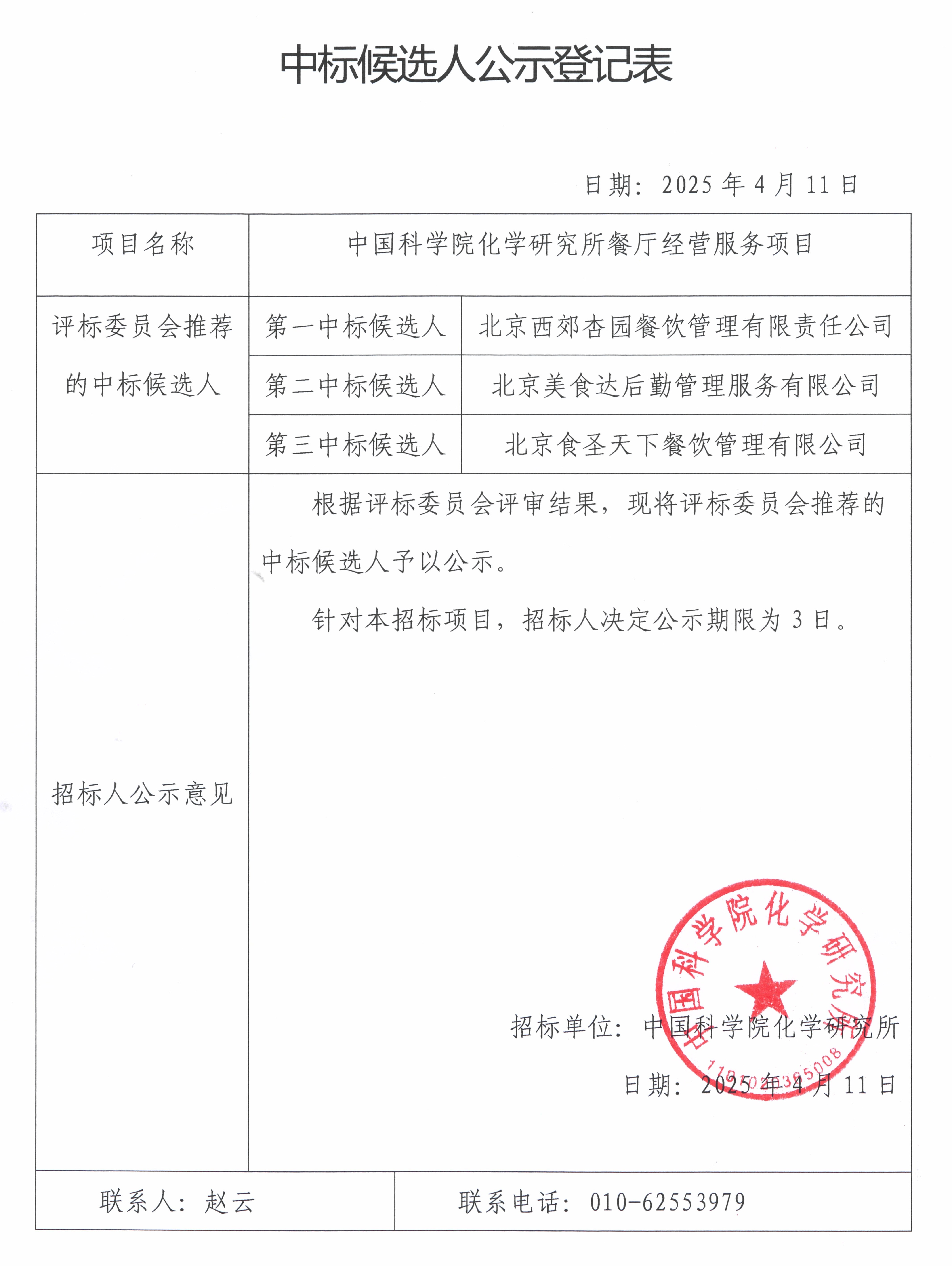 中国科学院化学研究所餐厅经营服务单位中标候选人公示