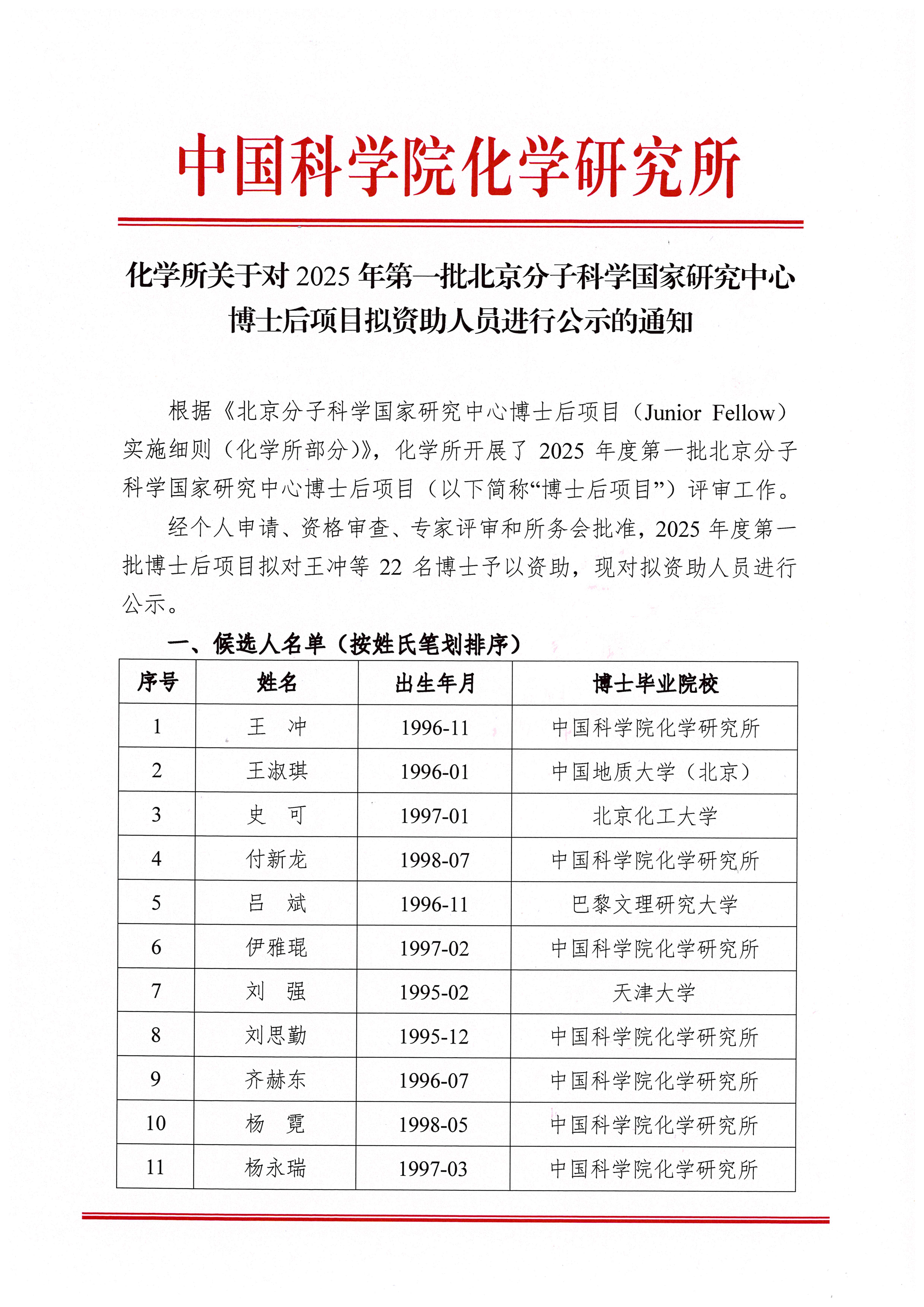 化学所关于对2025年第一批北京分子科学国家研究中心博士后项目拟资助人员进行公示的通知