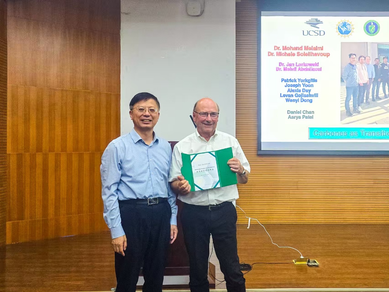 2025年9月18日,美国加州大学圣地亚哥分校Guy Bertrand教授访问化学所,并作题为“Carbenes as Powerful Transition-Metal Surrogates”的分子科学前沿讲座。党委书记、副所长范青华研究员为Guy Bertrand教授颁发了分子科学前沿讲座荣誉证书,孟庆元研究员主持讲座。