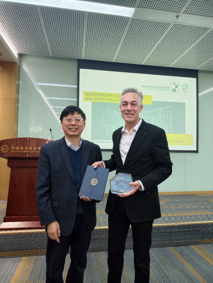 2025年11月25日,德国马普高分子研究所Mischa Bonn教授访问化学所,并作题为“Molecular Mechanics of Aqueous Interfaces: from Ångström Confinement to Electric Double Layers”的分子科学论坛报告。党委书记、副所长范青华研究员为Bonn教授颁发了“分子科学论坛”荣誉证书和奖牌,张贞研究员主持讲座。