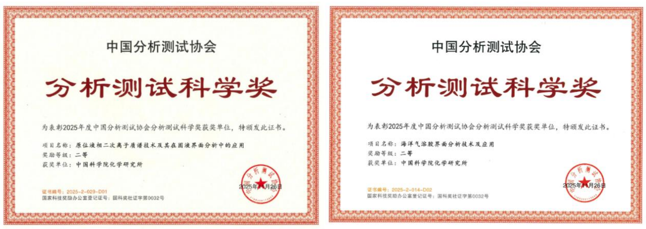 “原位液相二次离子质谱技术及其在固液界面分析中的应用”(第一完成单位:中国科学院化学研究所;完成人:张燕燕、汪福意、陆成海、辛森)和“海洋气溶胶界面分析技术及应用”成果(第二完成单位:中国科学院化学研究所;完成人:杜林,李坤,葛茂发等)荣获二等奖 。