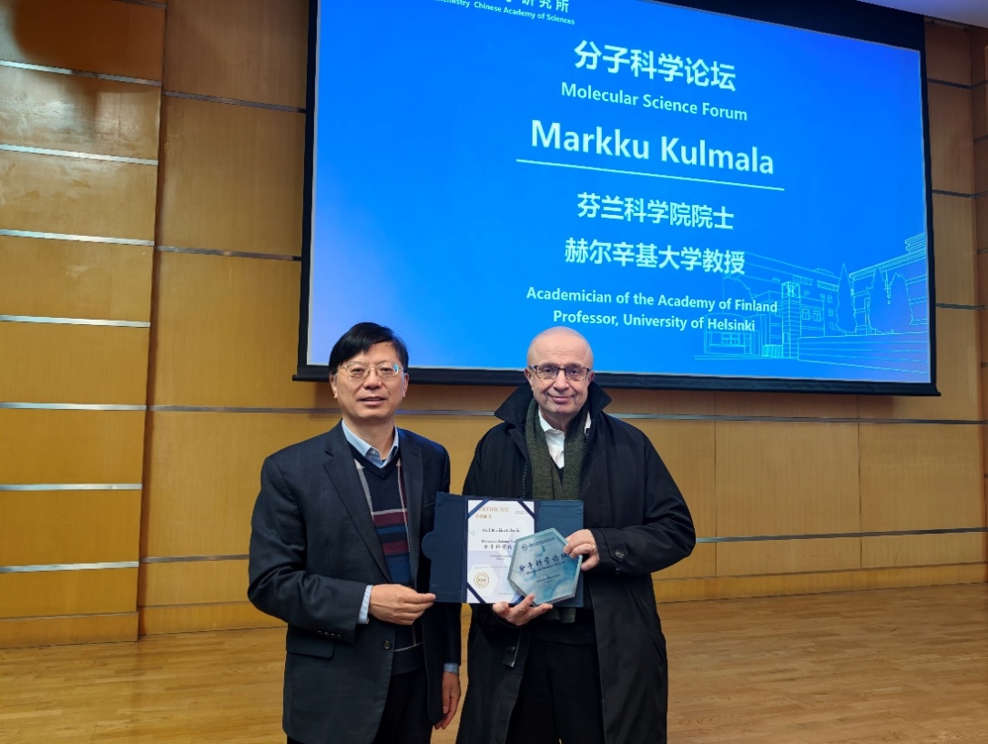 2026年1月21日,芬兰赫尔辛基大学Markku Kulmala教授访问化学所,并作题为“For the only planet we have”的分子科学论坛报告。党委书记、副所长范青华颁发了“分子科学论坛”荣誉证书,佟胜睿研究员主持讲座。