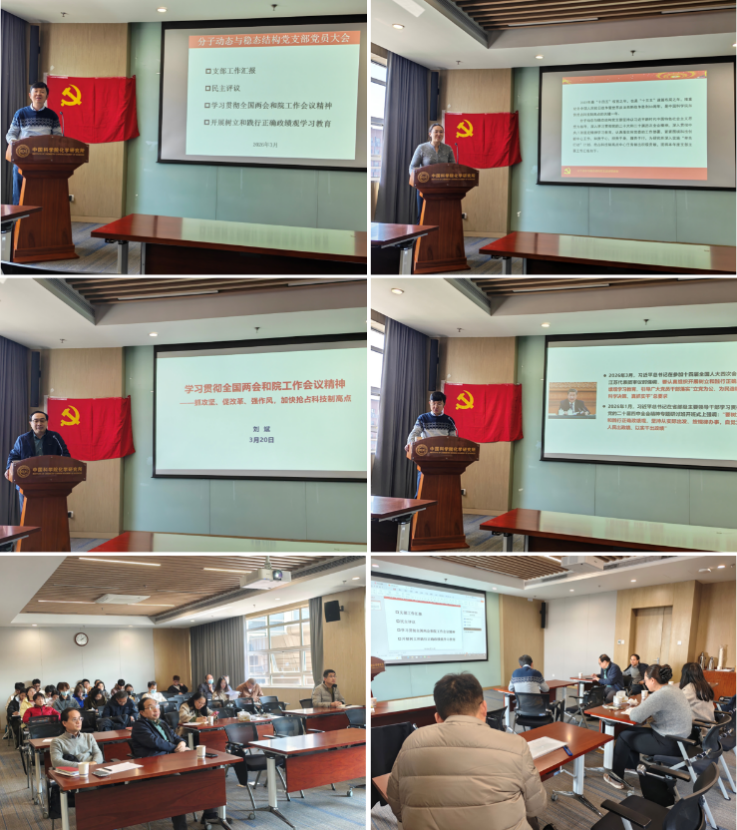 2026年3月20日,分子动态与稳态结构党支部召开党员大会,专题学习全国两会精神和院工作会议精神,部署启动树立和践行正确政绩观学习教育。纪委书记刘斌、党委委员葛茂发参会,党支部书记姚立主持会议。