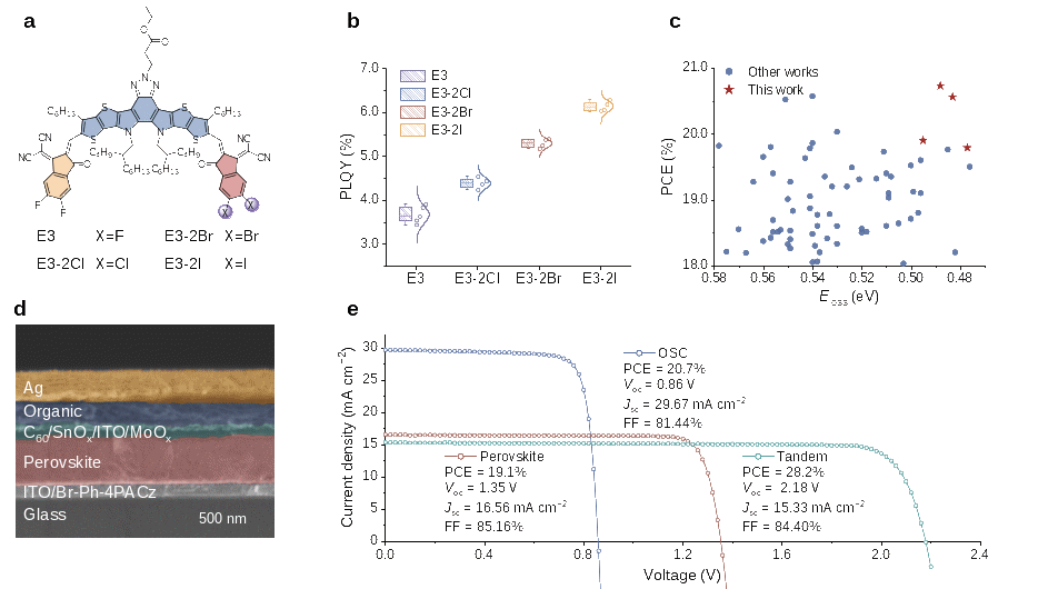 图1. (a) 小分子受体E3、E3-2Cl、E3-2Br和E3-2I的分子结构;(b) E3、E3-2Cl、E3-2Br和E3-2I的光致发光量子产率;(c) 已报道的二元有机太阳电池光电转换效率和能量损失总结;(d) 钙钛矿-有机叠层太阳电池的扫描电镜截面图;(e) 钙钛矿-有机叠层太阳电池的电流密度-电压曲线以及子电池和叠层电池的光伏性能