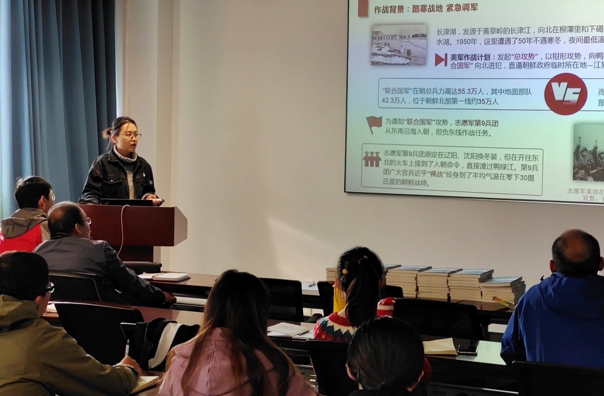 随后,按照支部“党员讲党史”的工作安排,党支部副书记卜文胜和党支部青年委员、学生党员季欣为大家作党史专题党课。卜文胜分享的是党在大革命时期,第一次国共合作从建立到破裂这段历史和党在这段时期所做的道路探索。党对中国革命性质和前途的认识,经历了一个逐步深入的过程。通过大革命失败的痛苦经历,认识到共产党领导、统一战线、武装斗争是中国革命的基本问题,形成了在无产阶级领导下的人民大众的反帝反封建的新民主主义革命理论。季欣以“冰血长津湖”为题,给大家讲述了抗美援朝中,中国人民志愿军第9兵团,在“艰苦程度超过长征”的残酷条件下,与武器装备远超我军的美军第10军,在朝鲜长津湖地区进行殊死较量,全歼美军一个整团、迫使美军王牌部队经历了有史以来"路程最长退却"的长津湖战役。战役的惨烈程度、志愿军表现出来的超越极限的大无畏精神、特别是首位特级战斗英雄杨根思视死如归的英雄事迹和“冰雕连”呈战斗姿态耸立阵地的壮烈场景,让大家深深震撼。