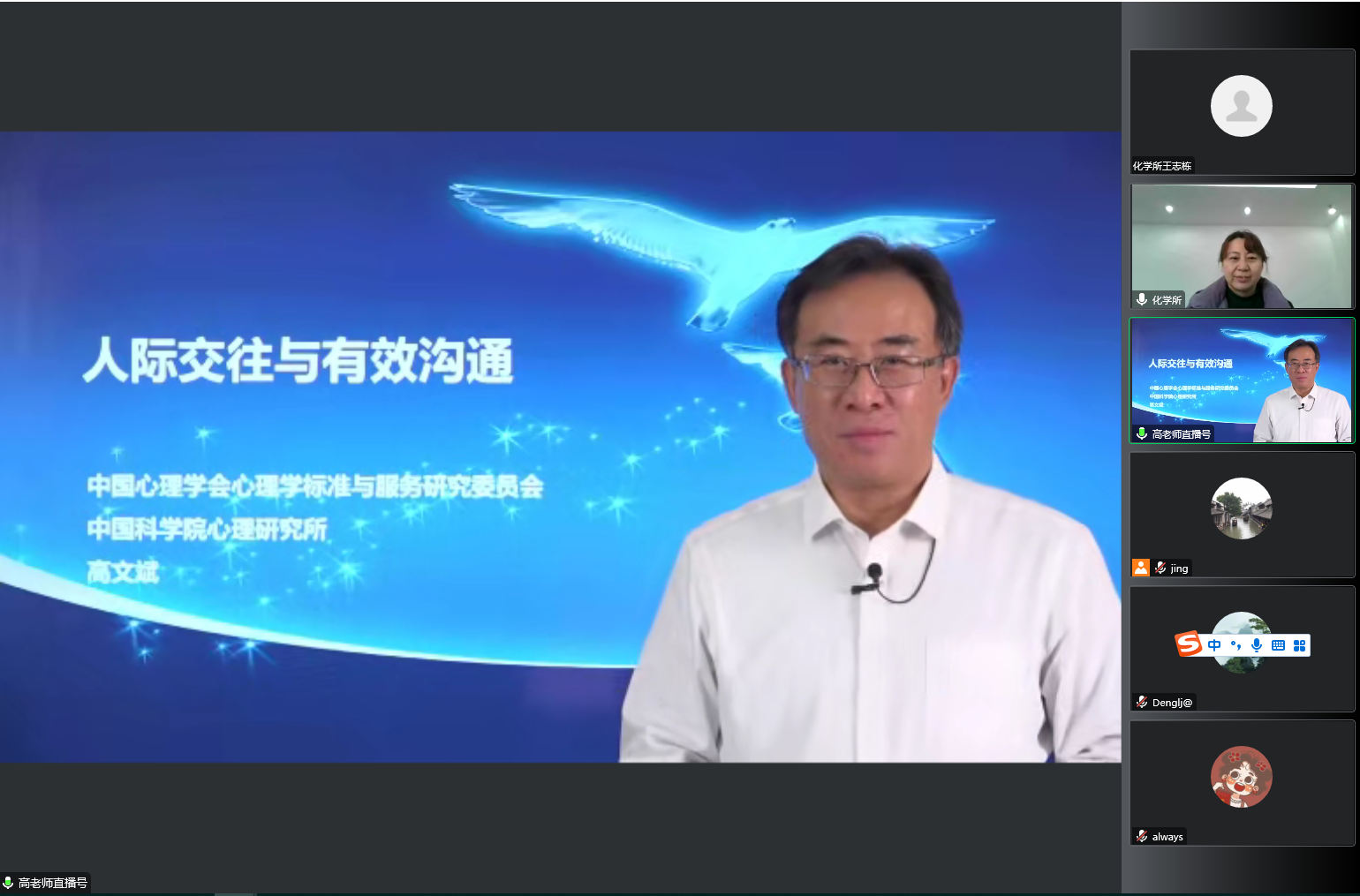 本次讲座的题目是“人际交往与有效沟通”,结合“三维平衡理论”与人的发展阐述了人是一切关系的总和,并结合当前疫情防控为大家列举了许多事例,理论与实际相结合,通过授课让大家了解什么是心理及心理能力、什么是有效沟通及无效沟通,话题轻松,深入浅出,诙谐幽默。报告结束后高老师与线上的师生进行了互动,回答了提出的问题。
