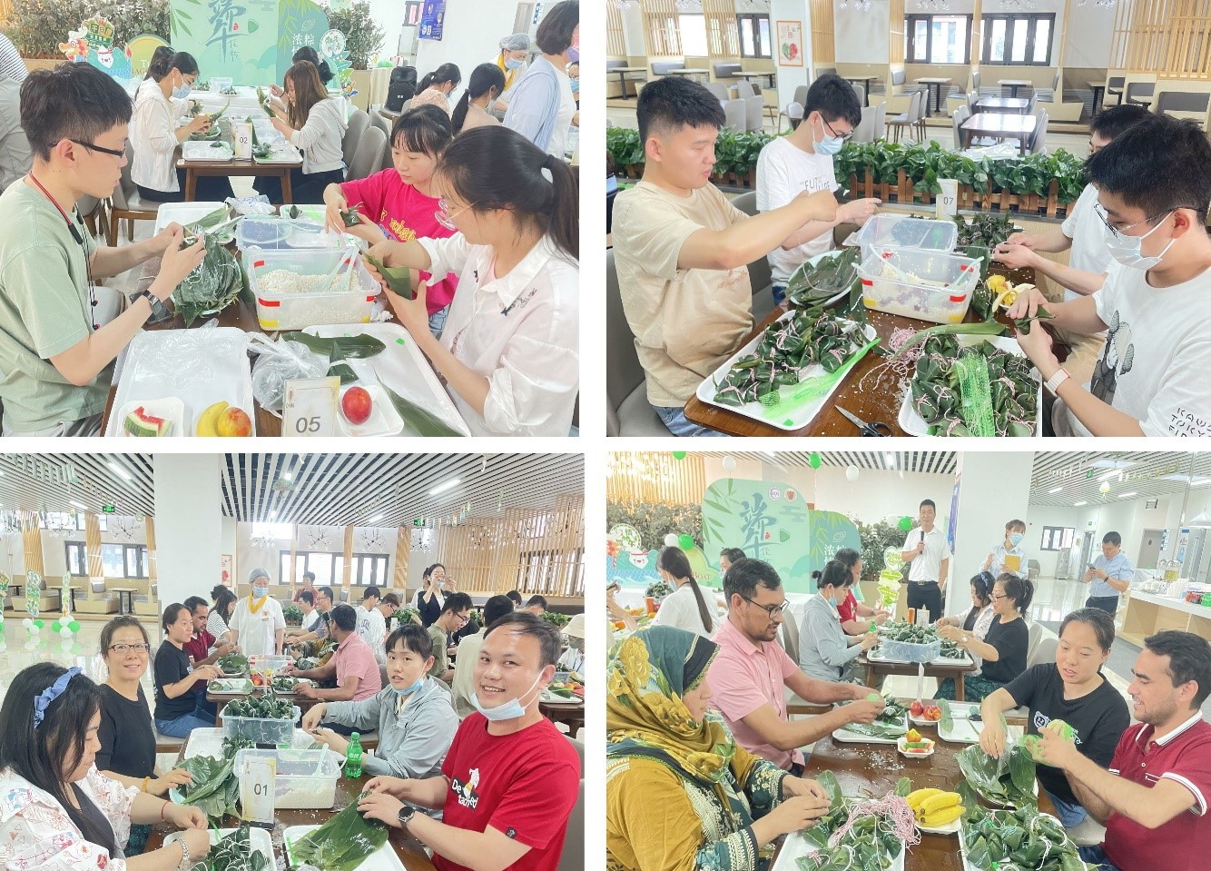 活动分为四场举行,每场36人。首先由资深授课老师现场给大家详细讲解了包粽子的步骤,从折叠粽叶、放入糯米、加入辅料、覆盖糯米、合上粽叶、裹上绳子,最后到绑紧打结。参与的师生们跃跃欲试,马上开始练习如何包粽子,外籍研究生在同学的帮助下也很快的完成了第一次包粽子任务。随后,4人一组进行20分钟的包粽子比赛,大家团结协作,一边包着粽子一边互相加油,在体验劳动乐趣的同时,感受节日的气氛,最后由评委老师根据粽子完成的数量和质量评选出每场的获奖队伍。食堂将每人当天包好的粽子煮熟后,由本人第二天中午领取,并与办公室的老师和同学一起分享劳动成果。