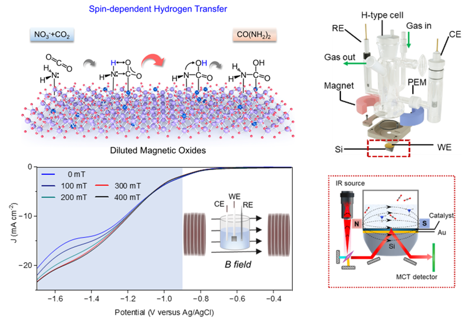 在国家自然科学基金委、中国科学院和化学所碳中和化学中心的支持下,化学所光化学实验室张闯课题组与盛桦课题组针对CO2RR中多电子、多质子转移过程伴随的复杂自旋态变化,构筑具有特定自旋结构的磁性催化剂体系,提升CO2向高值化学品的转化效率。近期,该研究团队发现,利用稀磁氧化物Cu-In2O3电催化CO2和NO3-偶联合成尿素时,外磁场可直接消除尿素合成线性扫描伏安曲线(LSV)的平台限制电位,在低过电势下将尿素产率最高提升2.2 倍,法拉第效率近乎翻倍 (图1)。借助自主开发的磁-电化学原位红外光谱技术,团队发现*CO2与*NH2通过氢键产生自旋相互作用,形成自旋敏感的关键反应中间体*NHCOOH;外磁场显著加速了氢转移过程中N-H键的断裂与O-H键的生成。该工作率先将自旋增强机制拓展至CO2向C–N 产物转化的催化体系,相关成果发表于CCS Chem.期刊(DOI: 10.31635/ccschem.025.202506003)。第一作者是郝晋杰博士,通讯作者是张闯研究员和盛桦研究员。