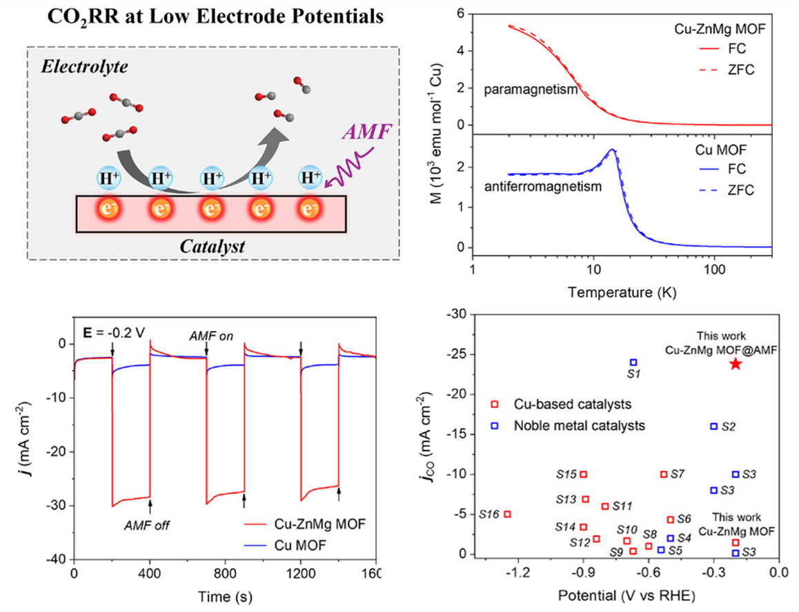 最近,该研究团队设计合成了Cu-ZnMg超薄金属有机框架(MOF)催化剂,通过非磁性 Zn/Mg打破Cu-Cu反铁磁耦合作用,形成s=1/2的孤立Cu位点用于构建自旋催化体系。在交变磁场作用下,孤立Cu位点发生自旋翻转并通过自旋-晶格弛豫产生瞬时局域能量,驱动CO2RR中协同质子-电子转移(CPET)动力学过程,大幅提高Cu位点的催化反应活性(图2)。在-0.2 V vs. RHE低过电位下,交变磁场显著提升了Cu-ZnMg催化剂性能,表现出-25.3 mA cm-2的CO分电流密度和约95%的CO法拉第效率,性能优于绝大多数Cu基催化剂,甚至超过了典型的贵金属催化剂。该工作率先将交变磁场耦合策略引入自旋增强CO2催化转化体系,相关成果发表于Angew. Chem.,Int. Ed.期刊(DOI: 10.1002/anie.202514255)。第一作者是尹百鹏助理研究员和王灿,通讯作者是张闯研究员。