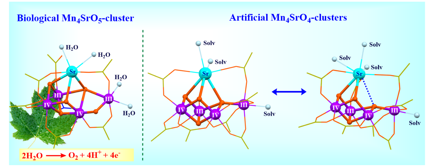 光合作用水裂解催化中心(又称放氧中心,简称OEC)是自然界唯一能高效、安全将水裂解为电子、质子和氧气的生物催化剂。生物OEC是一个独特的Mn4CaO5-簇合物,其钙离子可被锶离子替换形成一个Mn4SrO5-簇合物。研究OEC的构效关系、催化机理和人工合成策略,因具有重要的科学意义和潜在的应用价值长期以来广受关注,但也一直是极具挑战性的科学前沿。