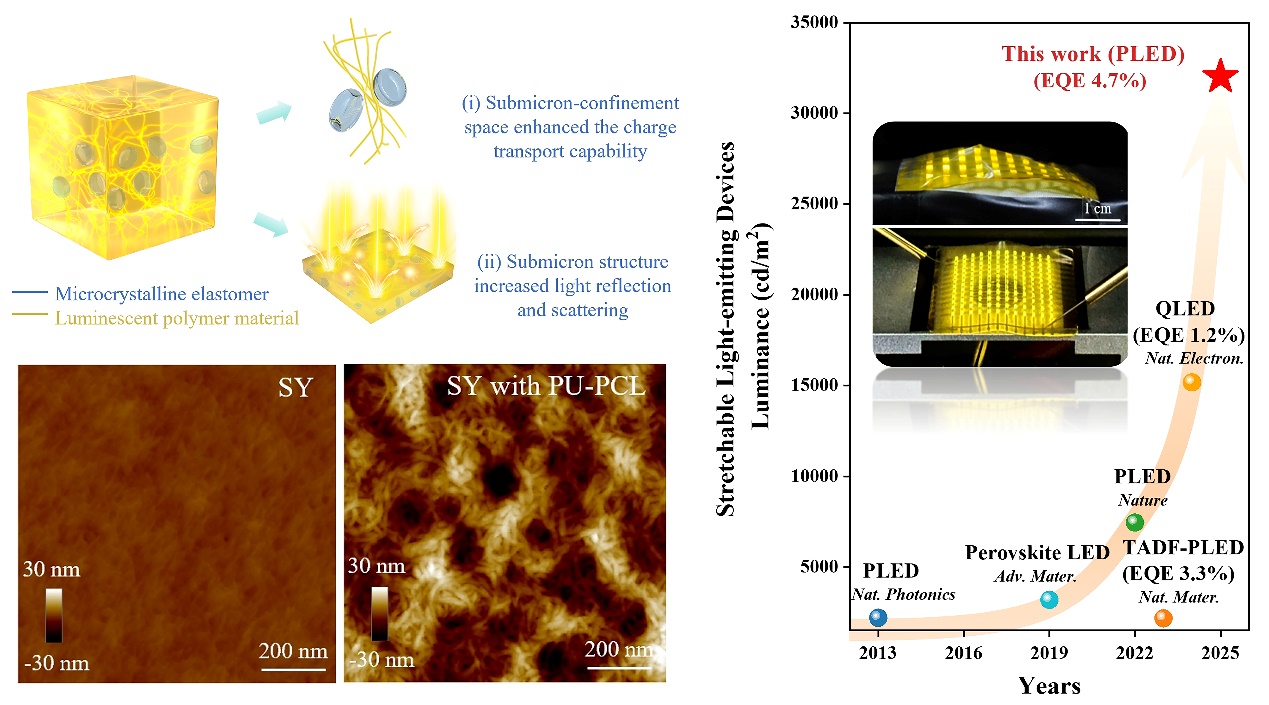 基于微晶弹性体-发光聚合物策略制备的本征可拉伸PLED,光电性能和机械稳定性显著提升