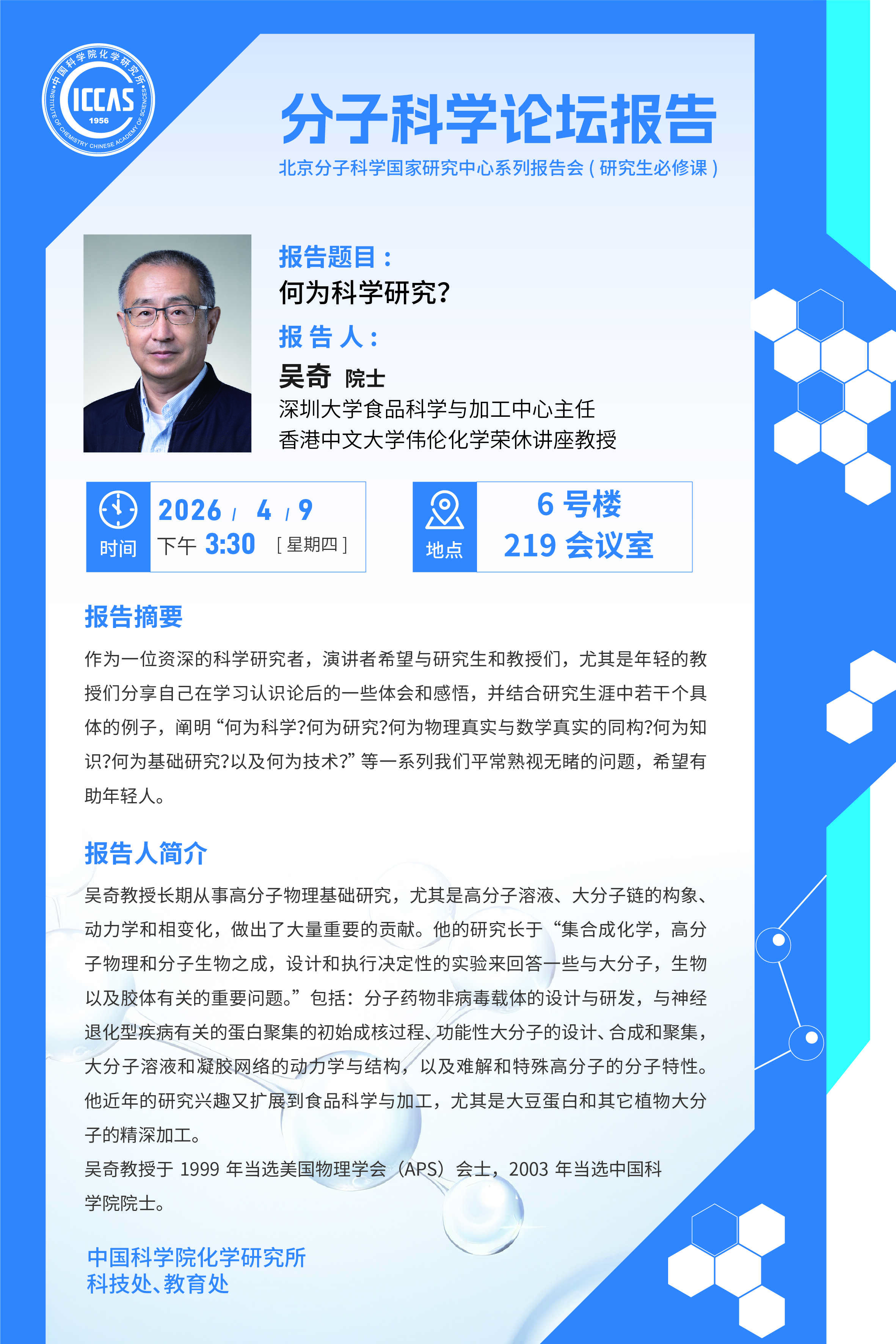 深圳大学吴奇院士拟于2026年4月9日访问化学所并作分子科学论坛报告