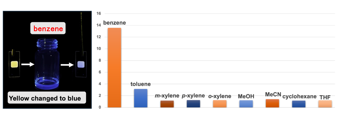 在我们身边,从某些工业车间、汽车尾气,到家居装修材料,一种名为“苯”的无色气体可能正悄然弥漫。这种挥发性有机化合物毒性强、易挥发,是公认的一类致癌物。然而,检测它却非易事,传统方法依赖庞大昂贵的实验室仪器,无法实现随时随地快速预警。中国科学院化学研究所的研究团队开发的一种基于 “超分子热激活延迟荧光材料” 的新型传感器,能够用肉眼在十秒钟内快速、可视化地检测痕量苯蒸气,检测限低至 3.5 毫克/升。