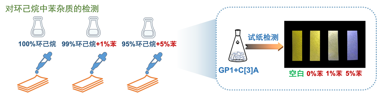 基于此,研究人员开发了极为便捷的检测工具。他们可以将材料制成薄膜,作为可视化泄漏报警标签。更有趣的是,他们还将材料做成了类似pH试纸的检测条。当需要检测工业常用溶剂环己烷中是否混有苯杂质时,只需将试纸条浸入溶液,在紫外灯光下观察颜色变化。这种低成本、可随身携带的试纸,让一线工人也能轻松完成安全筛查。