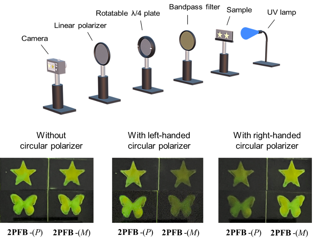 如何直观展示这种“旋转的光”?研究人员设计了一个巧妙的演示实验:他们将分别发出左旋和右旋圆偏振光的薄膜制成星形和蝴蝶图案,并排放置。在普通紫外灯下,两者同样明亮。但当在镜头前加入一个只允许左旋光通过的“滤镜”时,星形图案瞬间变亮,蝴蝶图案则明显变暗;换上右旋滤镜,情况则完全相反。这直观证明了材料发出的确实是高度纯化的圆偏振光。