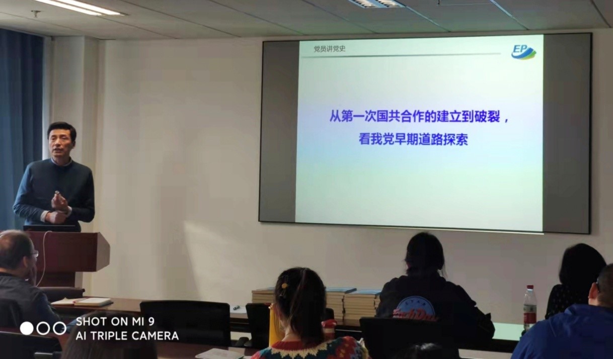 随后,按照支部“党员讲党史”的工作安排,党支部副书记卜文胜和党支部青年委员、学生党员季欣为大家作党史专题党课。卜文胜分享的是党在大革命时期,第一次国共合作从建立到破裂这段历史和党在这段时期所做的道路探索。党对中国革命性质和前途的认识,经历了一个逐步深入的过程。通过大革命失败的痛苦经历,认识到共产党领导、统一战线、武装斗争是中国革命的基本问题,形成了在无产阶级领导下的人民大众的反帝反封建的新民主主义革命理论。季欣以“冰血长津湖”为题,给大家讲述了抗美援朝中,中国人民志愿军第9兵团,在“艰苦程度超过长征”的残酷条件下,与武器装备远超我军的美军第10军,在朝鲜长津湖地区进行殊死较量,全歼美军一个整团、迫使美军王牌部队经历了有史以来"路程最长退却"的长津湖战役。战役的惨烈程度、志愿军表现出来的超越极限的大无畏精神、特别是首位特级战斗英雄杨根思视死如归的英雄事迹和“冰雕连”呈战斗姿态耸立阵地的壮烈场景,让大家深深震撼。