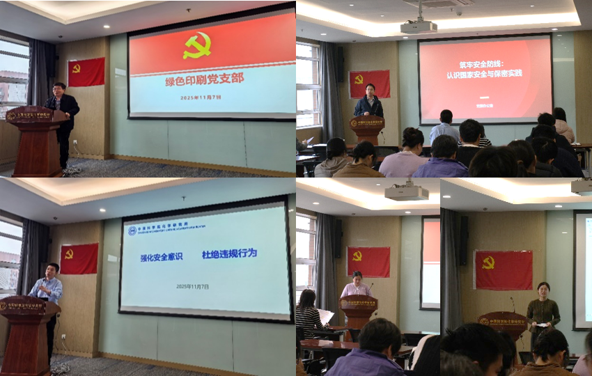 为进一步全面提升全体党员的安全意识和风险防范能力,2025年11月7日,绿色印刷党支部组织召开党员大会,开展 “强化安全意识,筑牢安全防线”安全与保密主题党日学习活动,研究讨论了组织发展、增选青年委员等事项。党委委员、绿色印刷实验室主任宋延林研究员参会,综合处副处长、科技安全管理办公室副主任张昌松作专题报告。