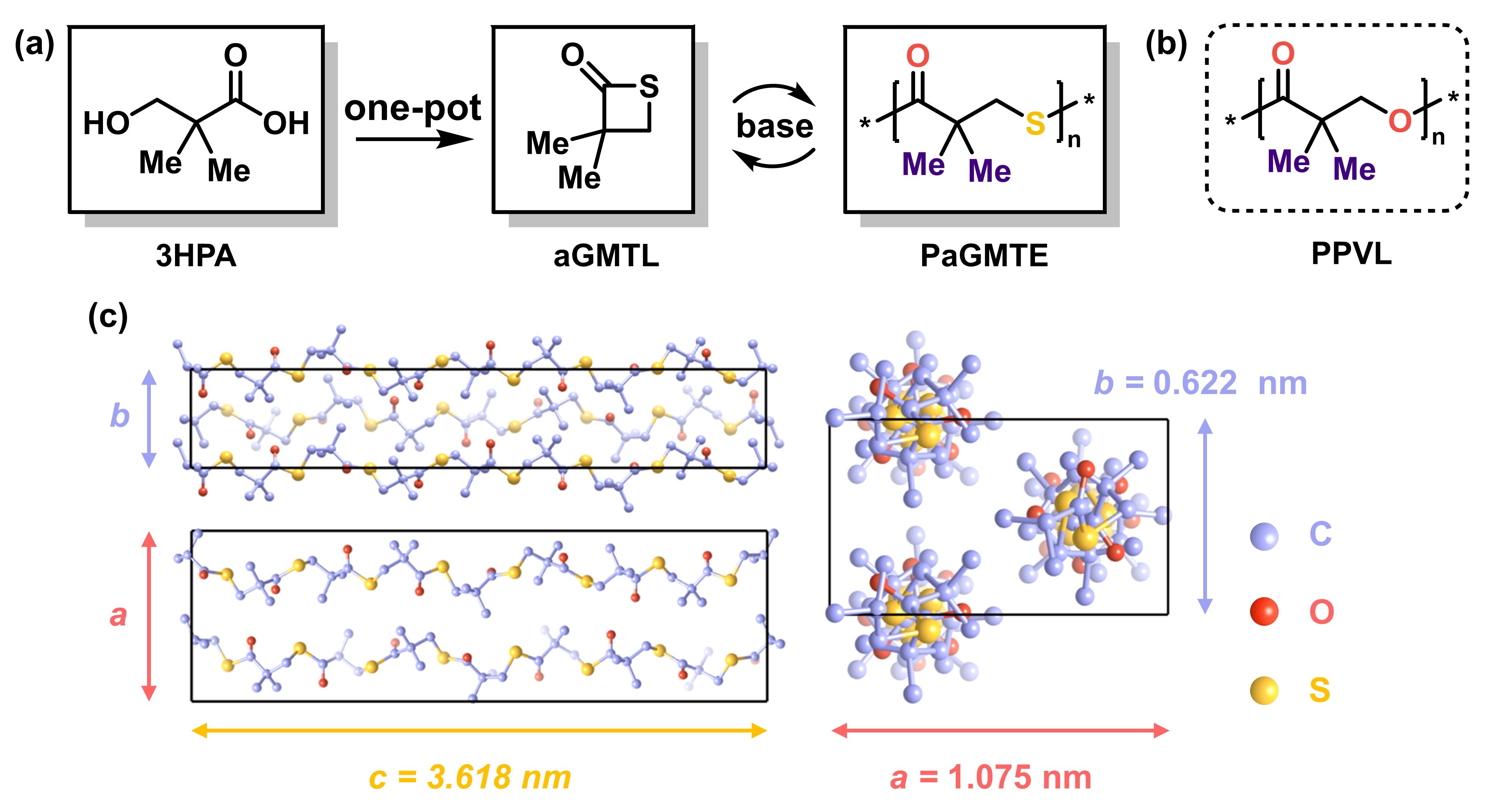 在国家自然科学基金委、北京分子科学国家研究中心支持下,中国科学院化学研究所刘国明研究员与北京大学化学与分子工程学院陈尔强教授、吕华教授合作,通过开环聚合成功合成了一种α-偕二甲基取代的聚硫酯PaGMTE(图1a)。该新型聚合物具有优异的闭环回收性能,可通过热解聚高效回收高纯度单体。基于刘国明等开发的PolymCrystIndex程序,研究团队通过X射线衍射解析了其晶体结构(图1c)。这是聚硫酯家族中首个被完整报道的晶体结构。