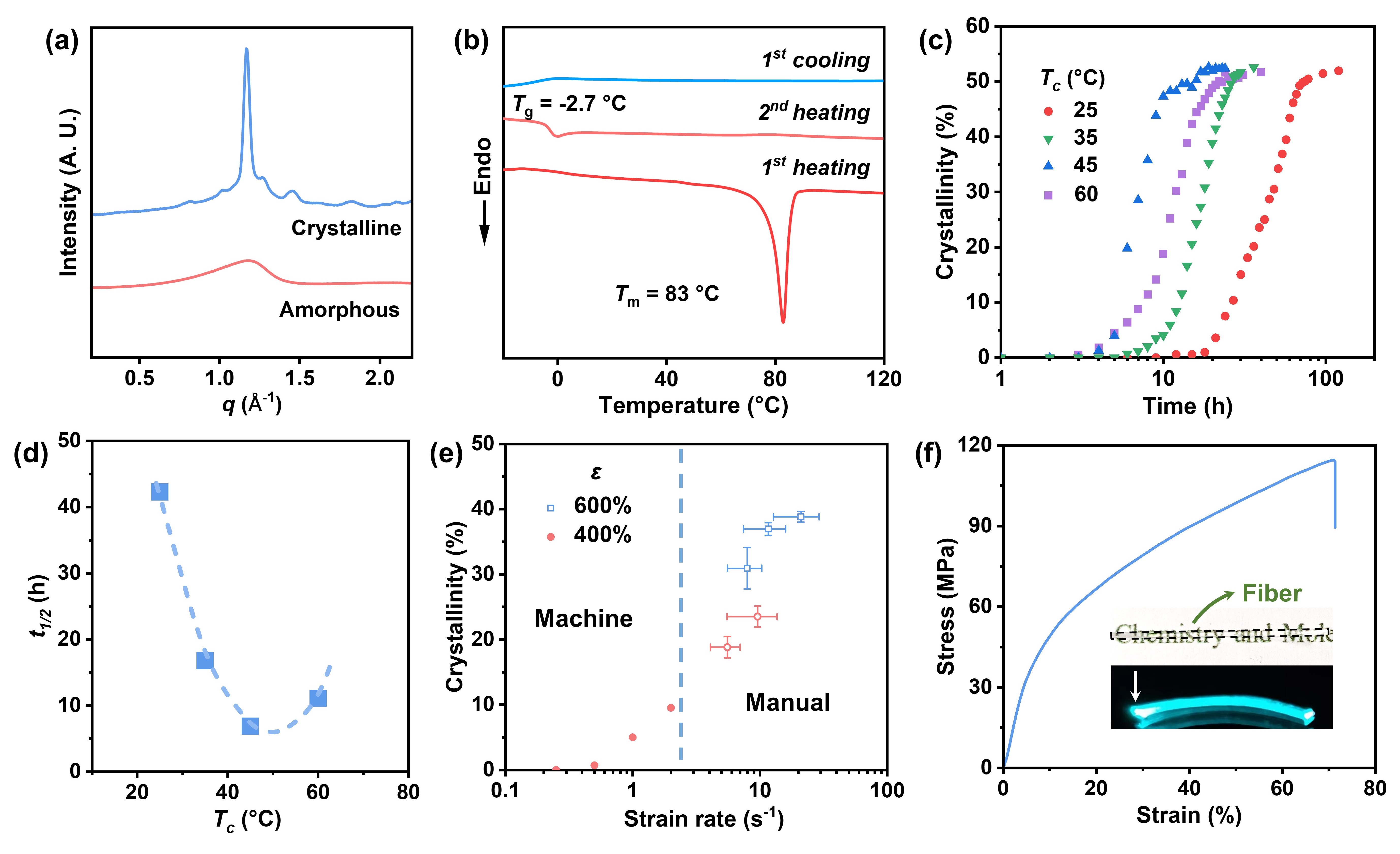 图2 (a-b) 半结晶性PaGMTE的WAXS谱图和DSC曲线;(c-d) 不同结晶温度下,PaGMTE的静态结晶行为;(e) PaGMTE的拉伸诱导结晶行为;(f) 透明PaGMTE纤维的力学性质与光波导性质。