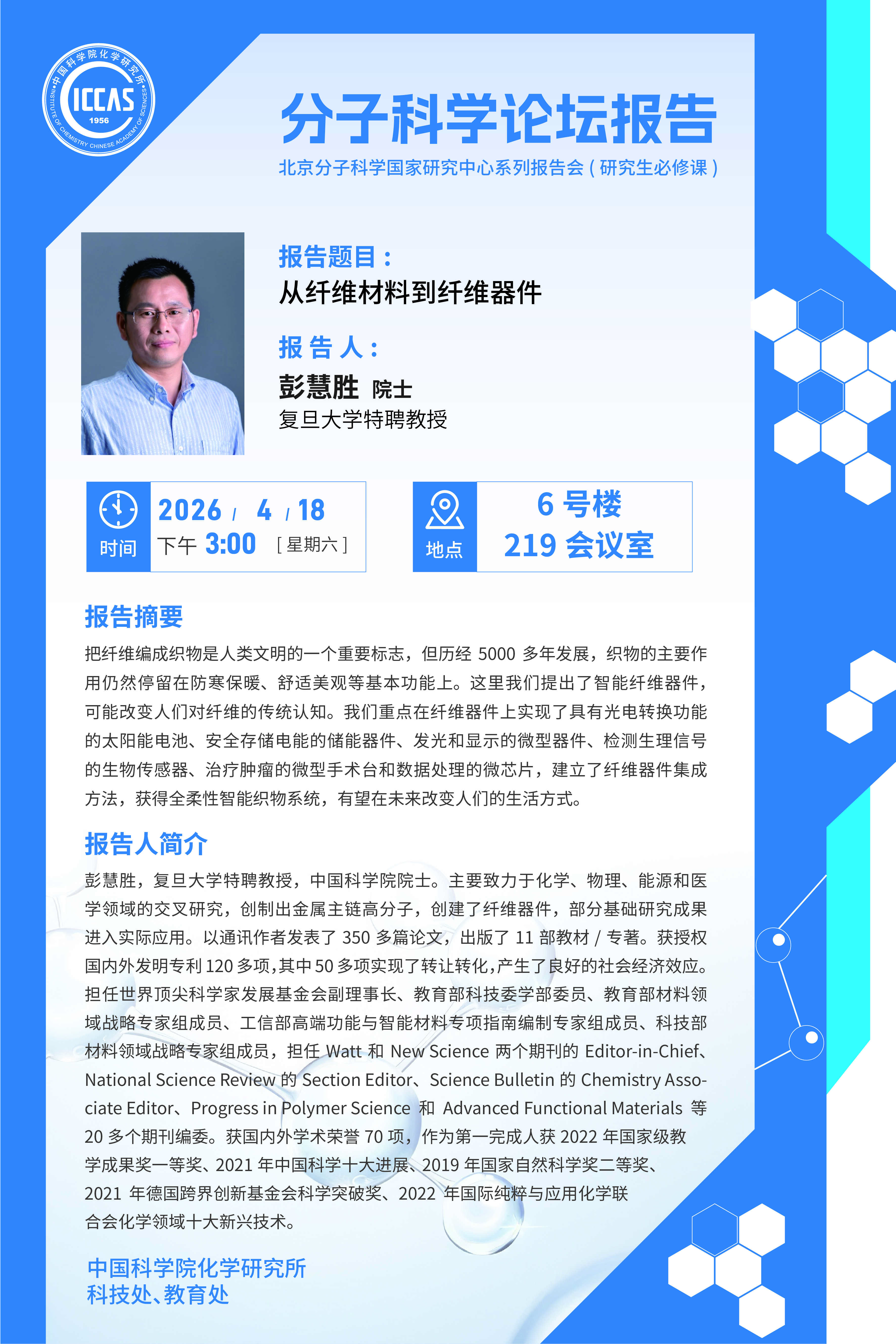 复旦大学彭慧胜院士拟于2026年4月18日访问化学所并作分子科学论坛报告